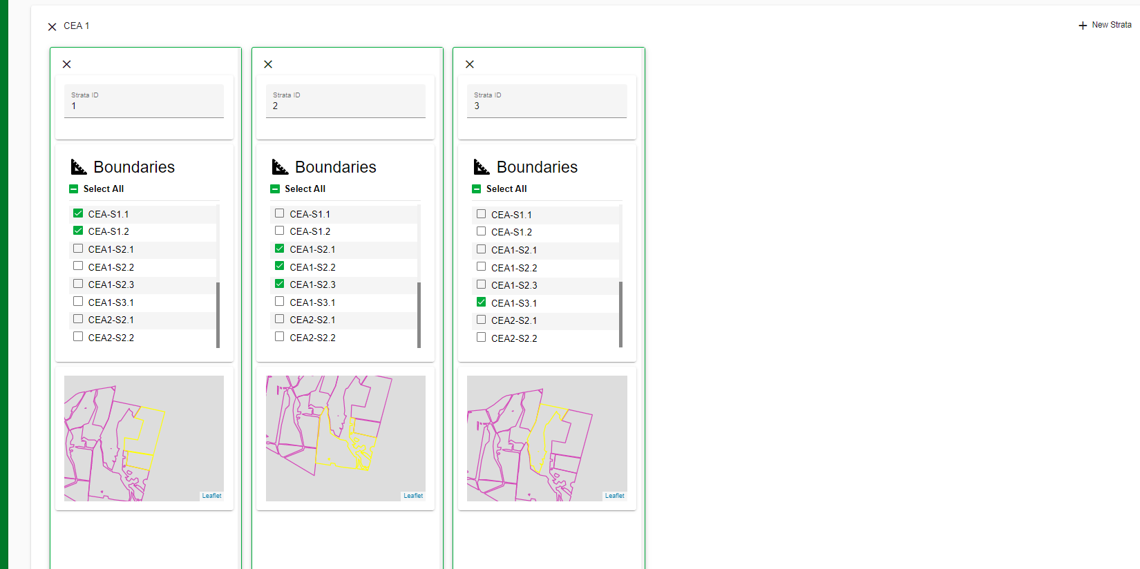 - A map will highlight the selected strata. For example, in the below example, 'Strata 1' consists of two separate boundaries; CEA-s1.1 and CEA-S1.2. These have both been selected and will be calculated together as 'CEA 1, Strata 1' in the calculations.