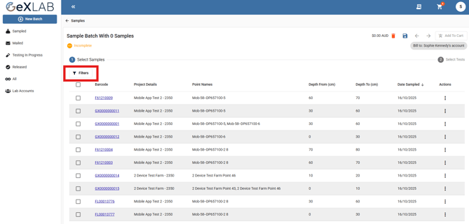 - Use the filter options to organize your samples. You can filter by: