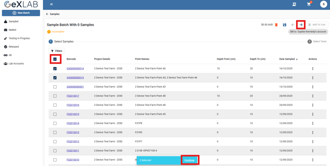 - Once you have selected all samples you would like to add to the batch, select "Continue" or use the arrow to add to the batch.