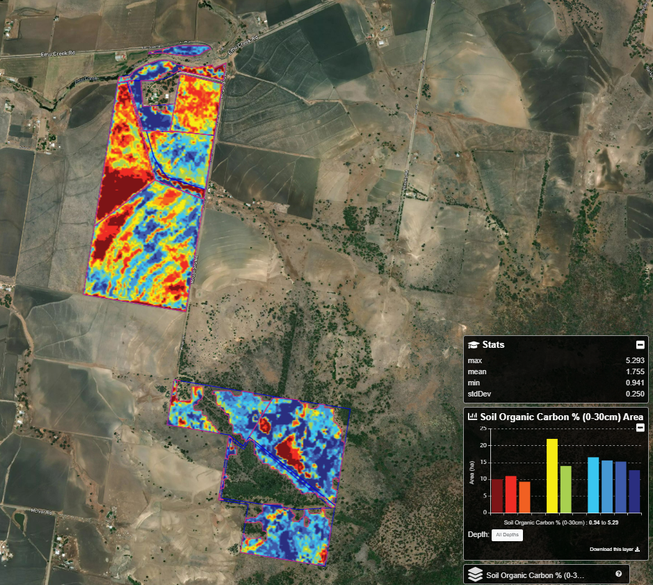 The Soil Organic Carbon % (SOC %) layer was developed by FarmLab using a combination of advanced machine learning techniques, historical soil data, and environmental factors as part of the National Soil Carbon Innovation Challenge. It is currently only available in Australia, however you can find out more about the background to the model and the challenge here: https://getfarmlab.com/advancing-soil-carbon-quantification-with-remote-sensing-and-machine-learning/